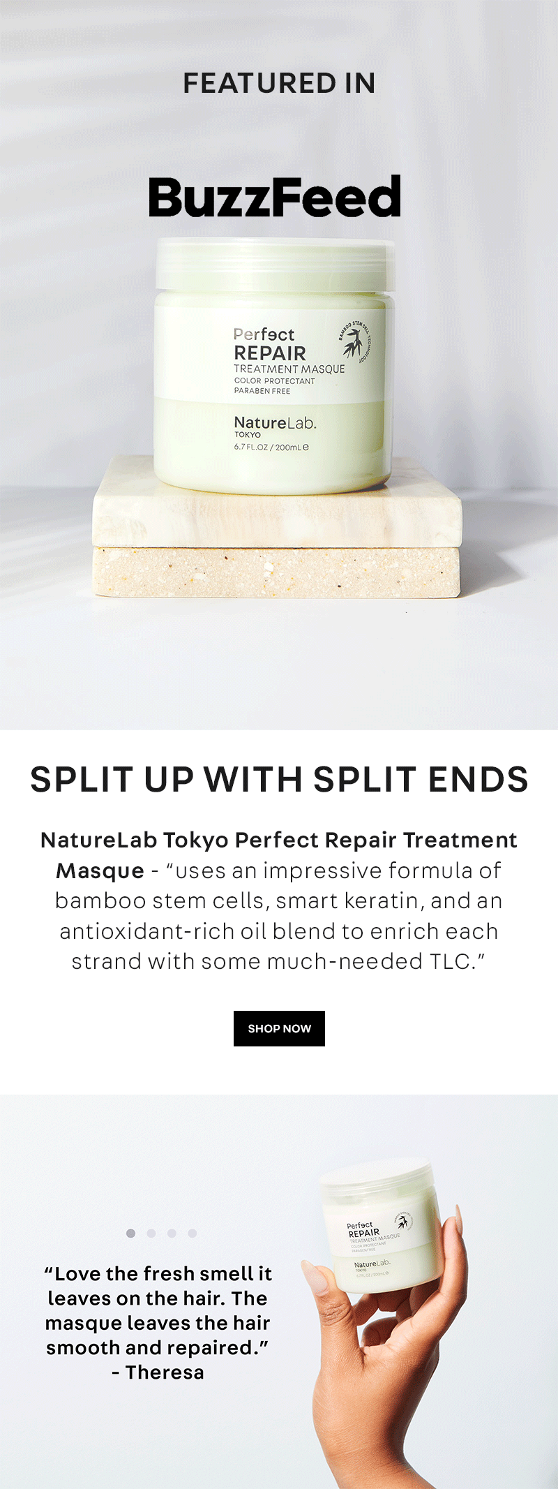 NatureLab. TOKYO’s Repair collection is designed to replenish moisture, repair damage, and protect against future breakage.