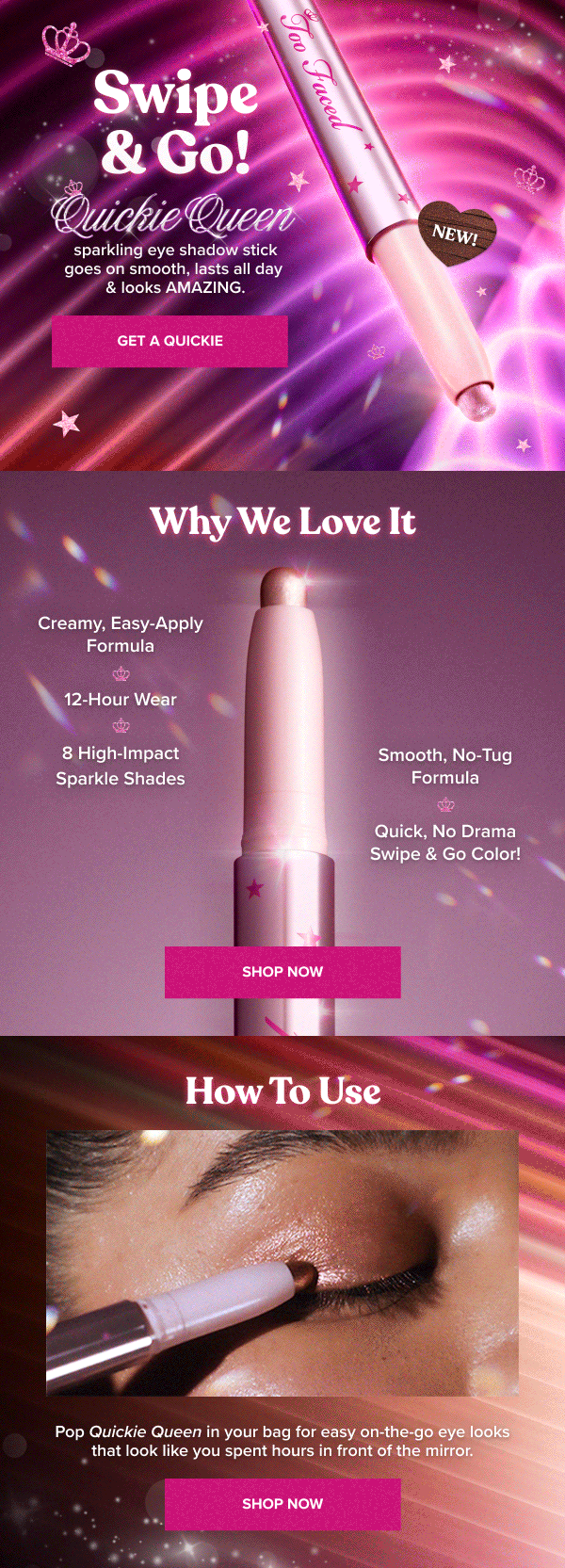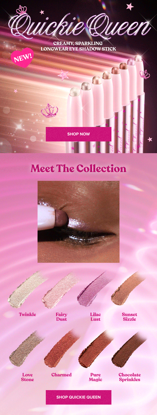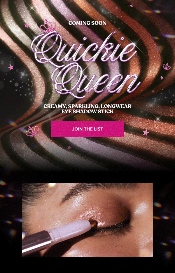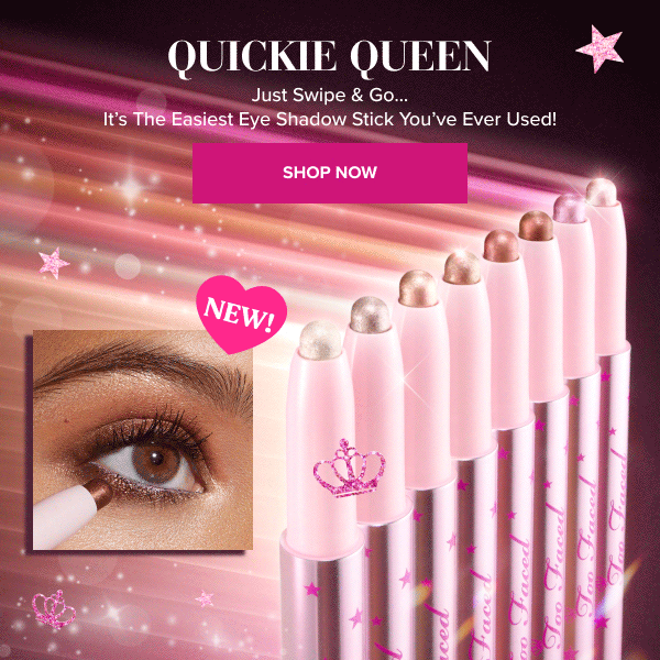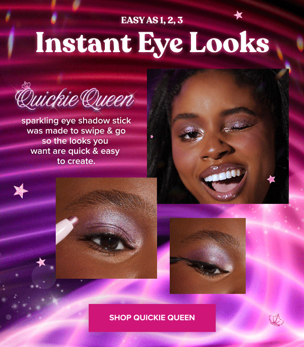 Quickie Queen is a weightless, creamy eye shadow stick illuminates and visibly awakens eyes with a soft wash of sparkling color that doesn’t crease & stays color true.